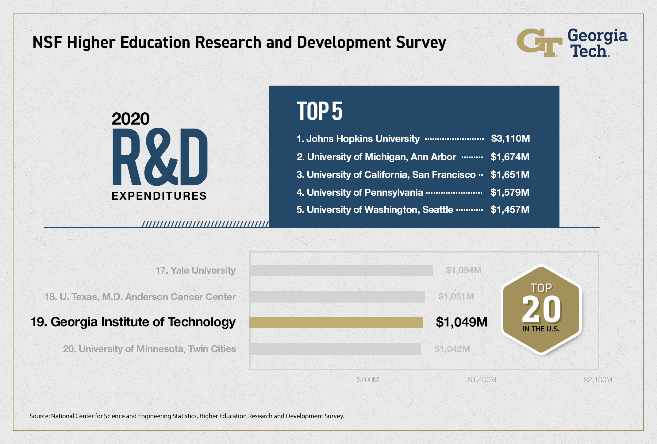 The Georgia Institute of Technology has broken into the top 20 in higher education research and development spending for the first time in a decade. The ranking, based on an annual survey conducted by the National Science Foundation (NSF), reflects a year of innovations in healthcare, computing, and sustainability research — even amidst a global pandemic.
