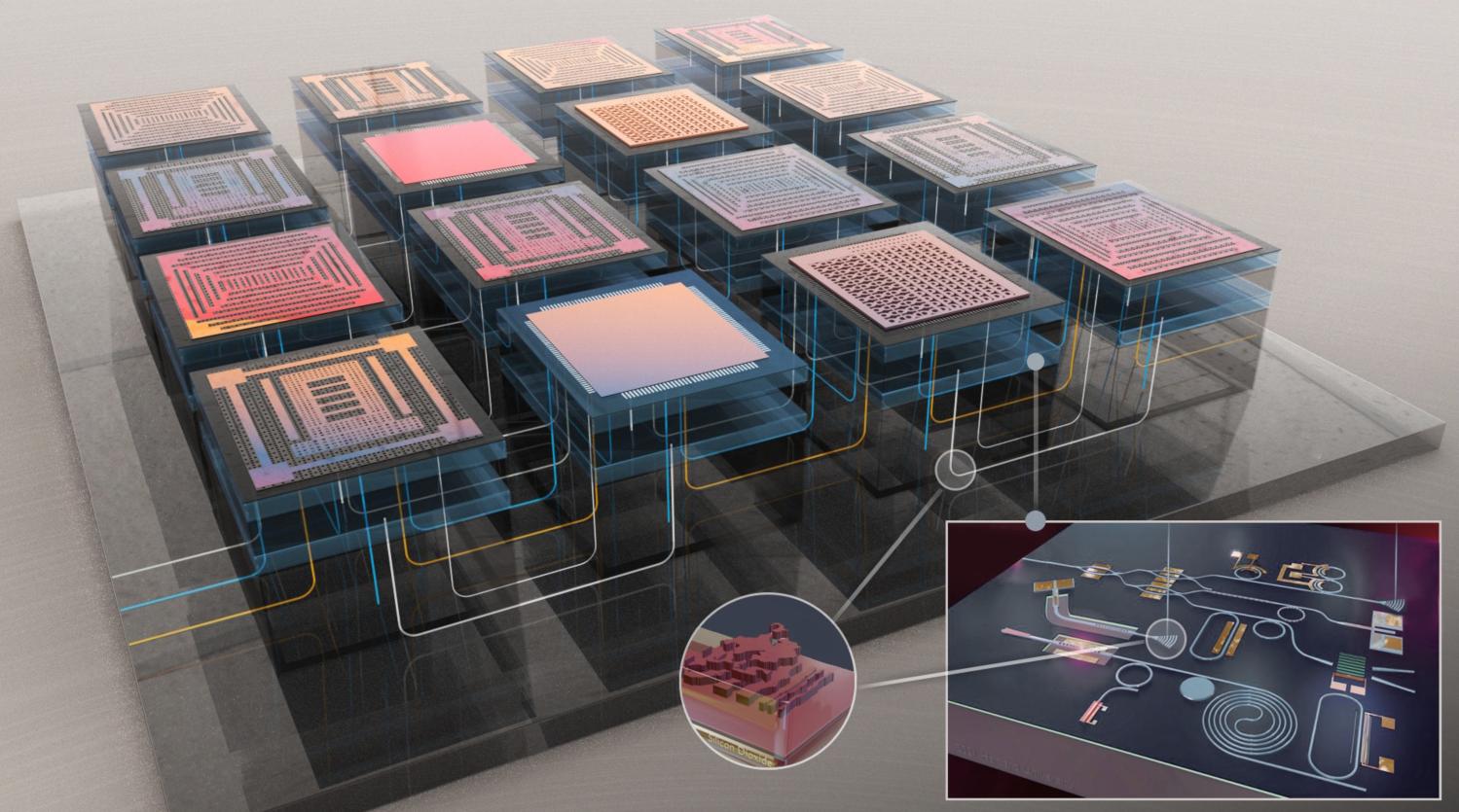 The key innovation is vertically connecting electronic chips in a compact stack. This design helps overcome the limitations of planar optical routing geometries (layouts that guide light horizontally across a chip) which are often not compatible with the dense, 3D chip architectures needed for next-generation computing.